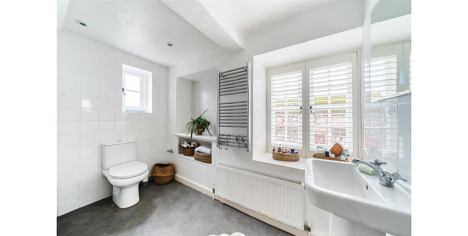 The cottage is entered through a small porch, which leads into a bright and welcoming living/dining room. With windows at both the front and rear, the space enjoys excellent natural light, and the impressive inglenook fireplace, complete with a Jotul™ gas stove and exposed timber beam, adds warmth and character. A ground-floor W.C. is accessed from this room. To the rear is the kitchen/breakfast room, fitted with a good range of units and integrated appliances including an electric double oven, gas hob, extractor, dishwasher, fridge/freezer, and washing machine. There is space for a breakfast table, and dual-aspect windows make it an enjoyable place throughout the day. A utility cupboard houses the boiler, and a pull-down ladder leads to additional loft storage above the kitchen.
