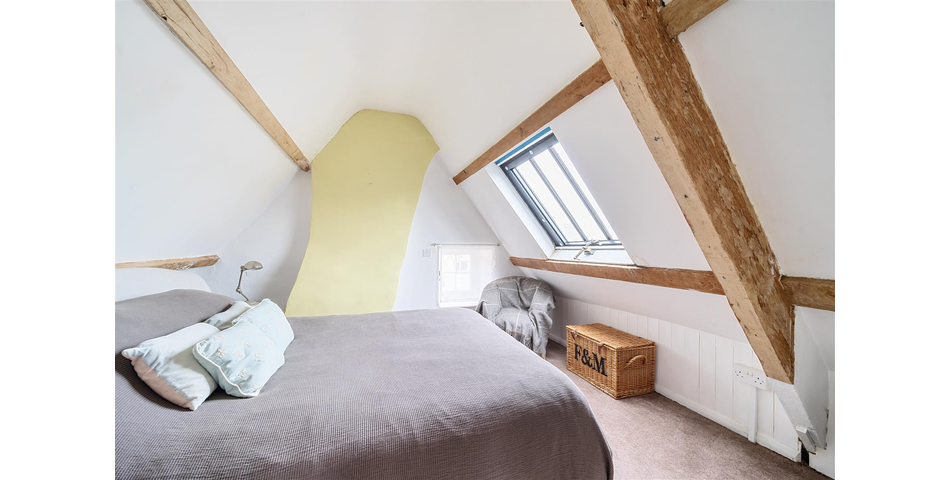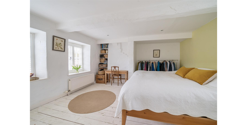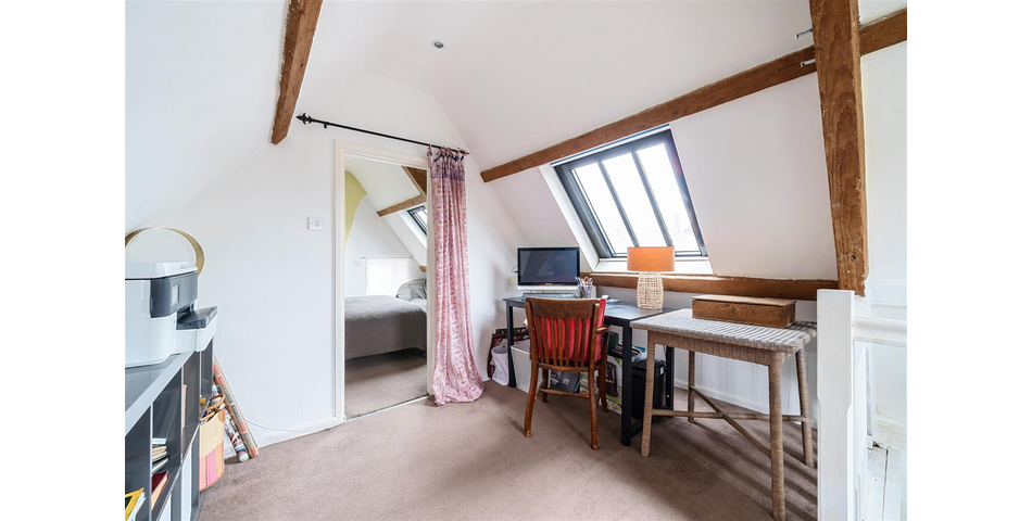 A further staircase leads to a naturally light attic room, ideal as a study, studio, or creative workspace. From the top of the stairs, there are attractive views across parts of the town and the surrounding countryside. Beyond this is the second bedroom, a cosy and versatile room suitable for guests, children, or an additional workspace.