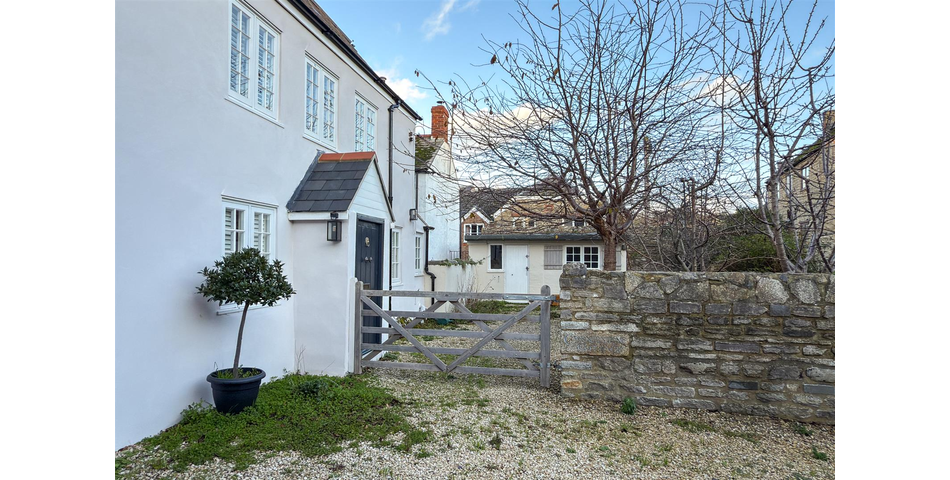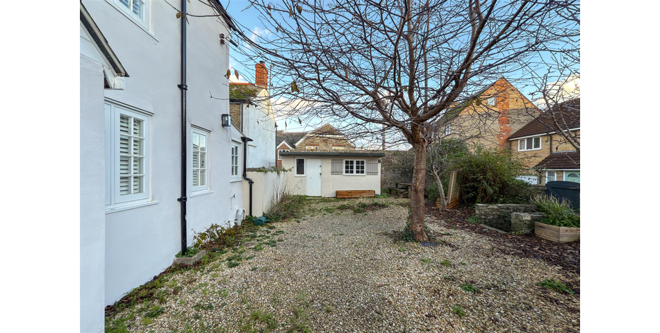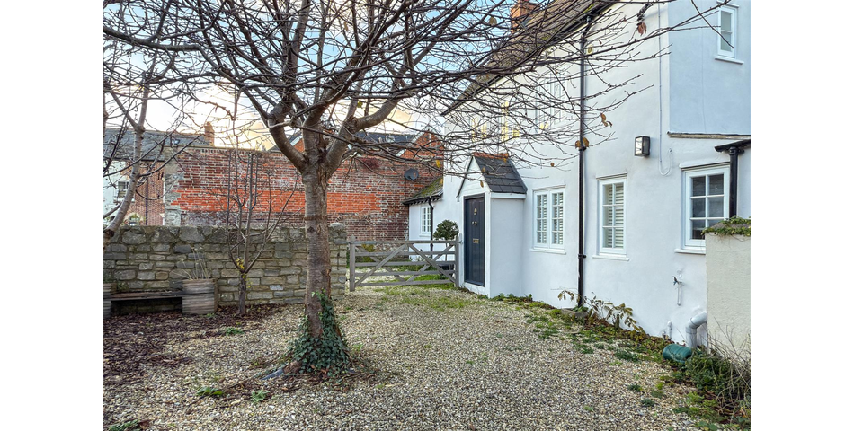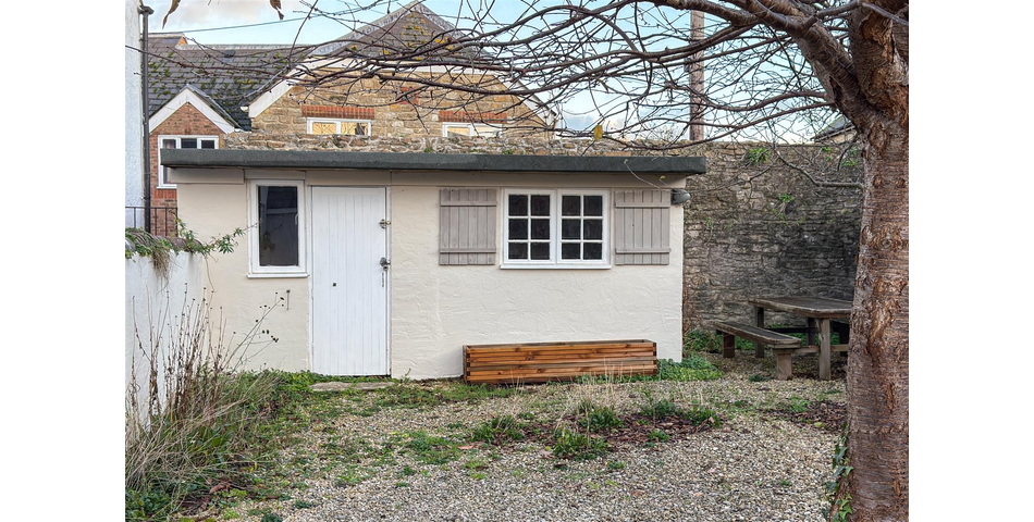 At the front of the property, a gravelled area provides off-road parking for several vehicles — a rare advantage so close to the town centre. A wooden gate opens into the private garden, designed for low maintenance with decorative stone, established shrubs, fruit trees, and raised planters. It offers a peaceful setting for outdoor dining and relaxation. A standout feature of the garden is the stone boundary wall, which contains fossilised ammonites — a distinctive reminder of the area’s Jurassic heritage. Set within the garden is a detached stone outbuilding, currently arranged as a workshop. With power connected, it offers excellent scope to be used as a studio, office, gym, or hobby room. A gate leads directly onto Folly Mill Lane for convenient pedestrian access to town.